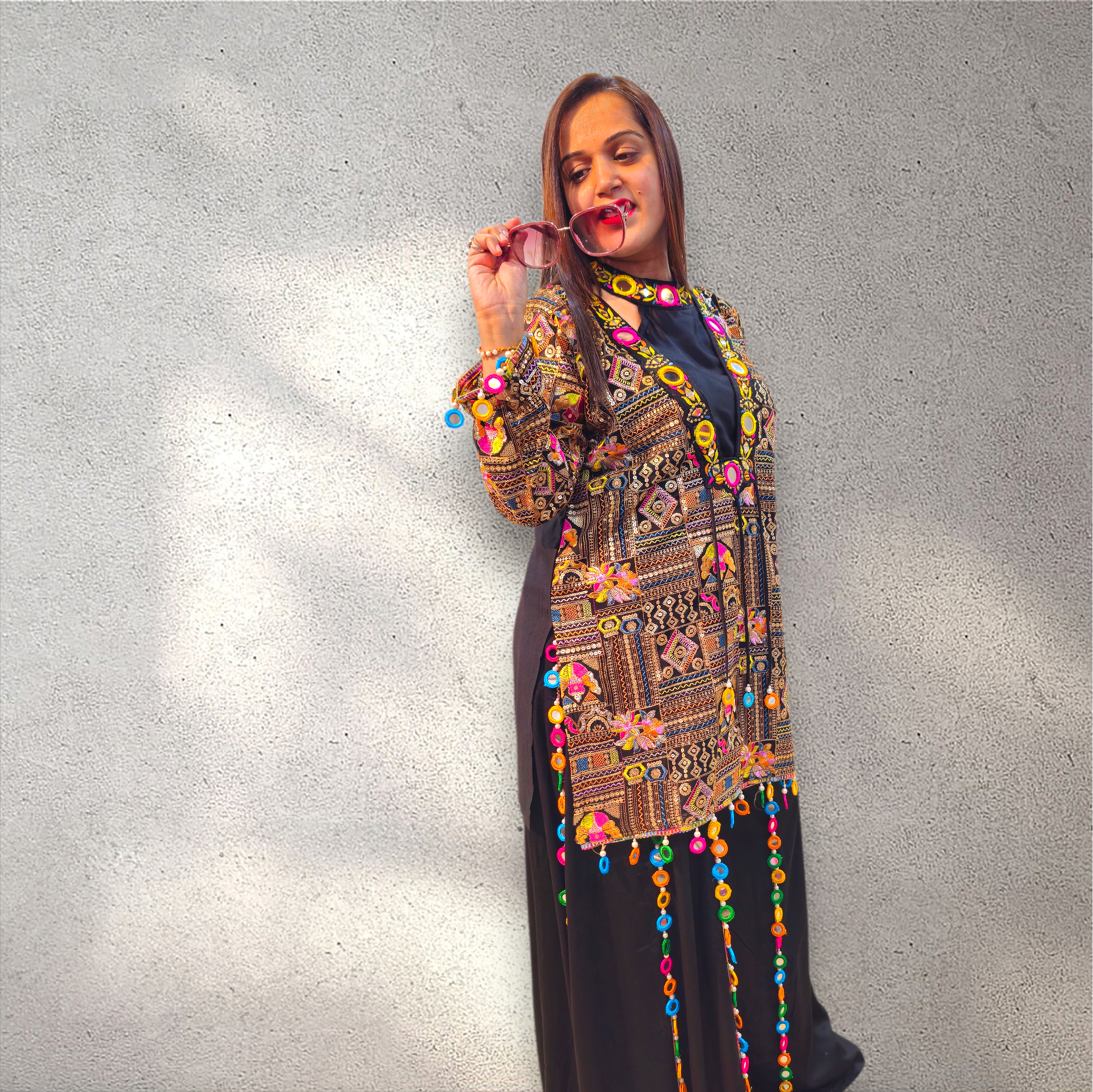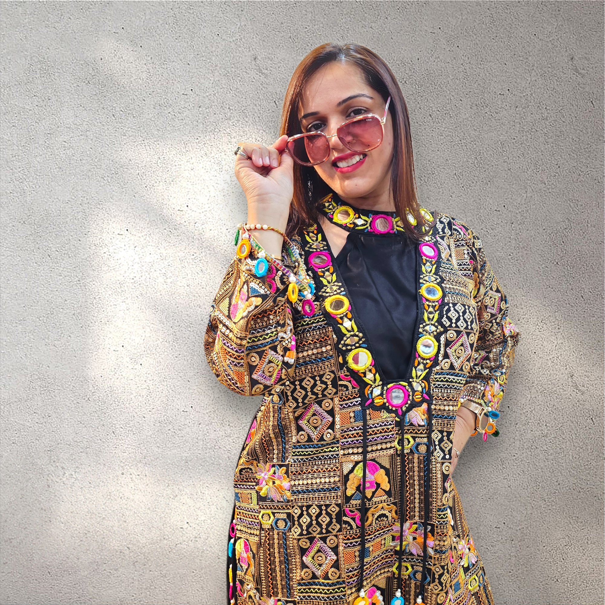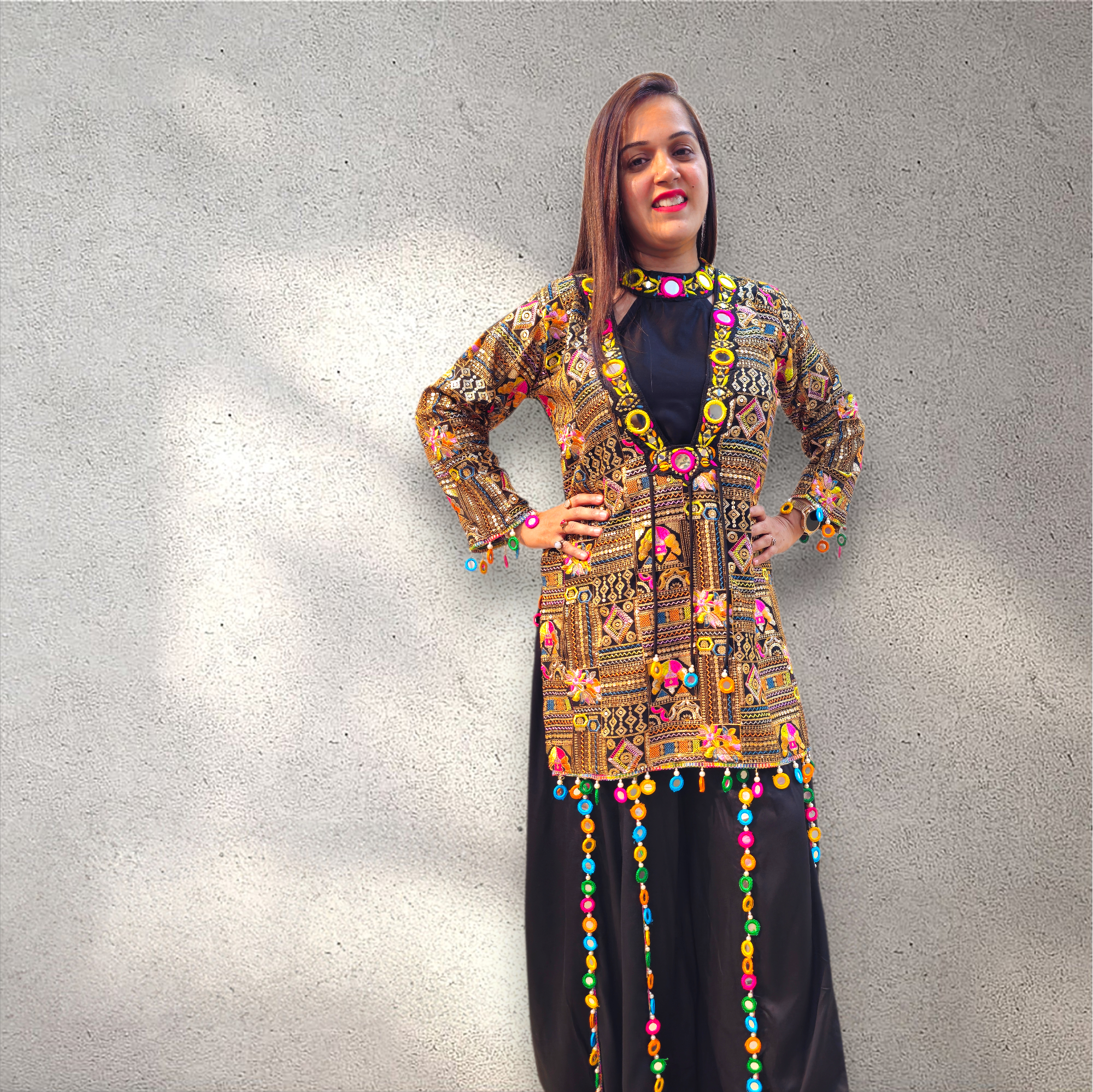 A vibrant Indo-Western ensemble featuring a beautifully embroidered jacket paired with a flowy black silhouette, highlighted by colorful mirror detailing. Elegant yet playful, this design is perfect for festive occasions and statement styling.
